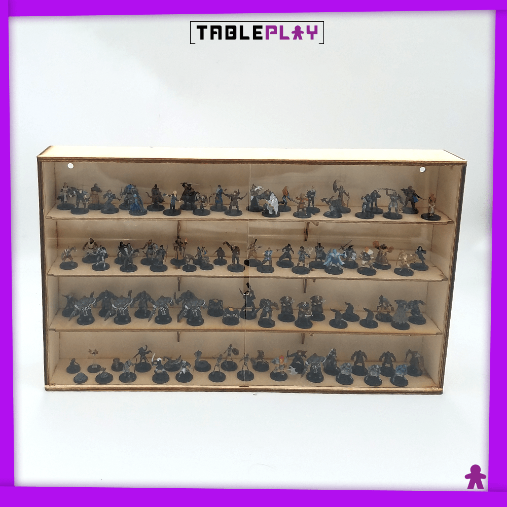 A wall-mounted display for your gaming miniatures. optional custom inserts for better organization.